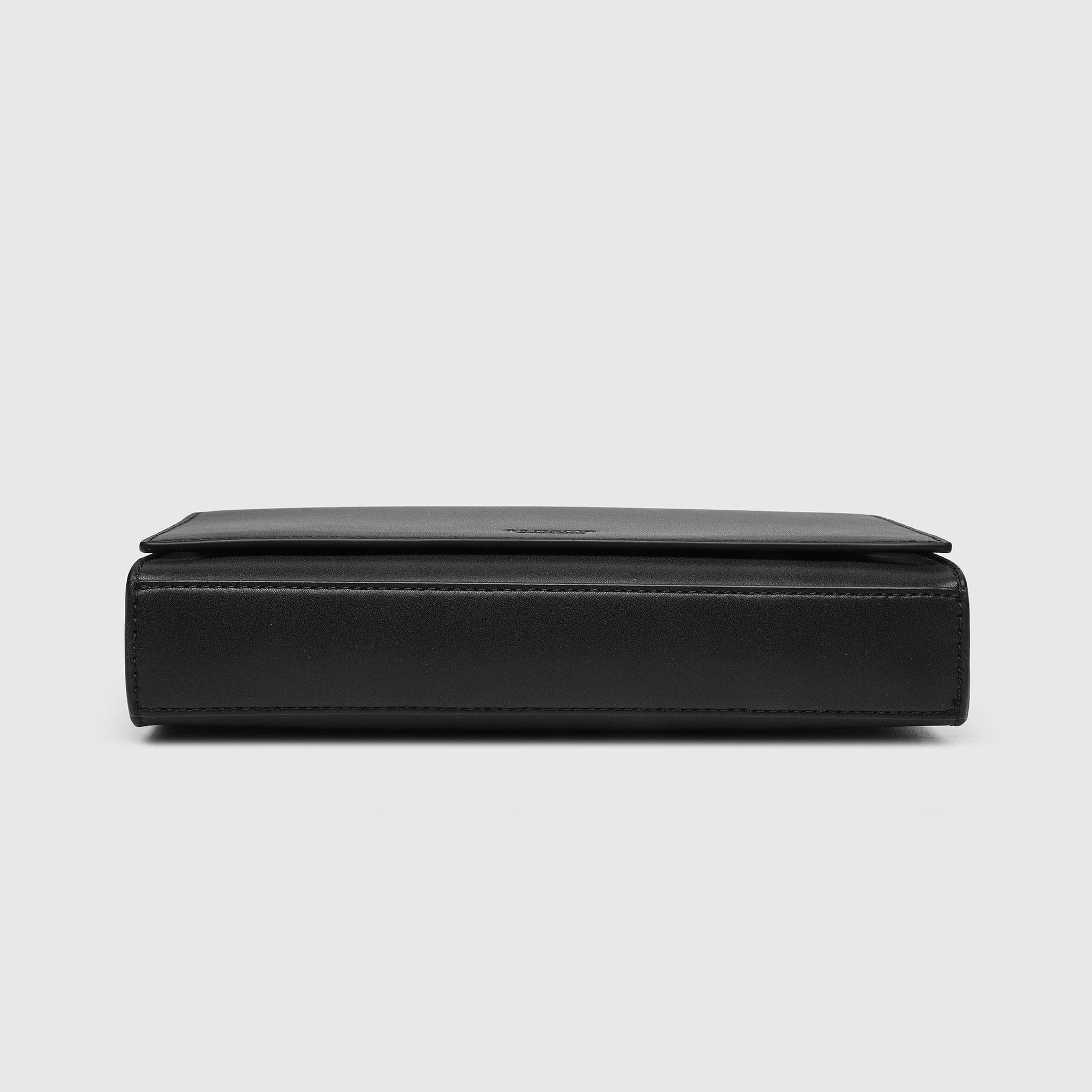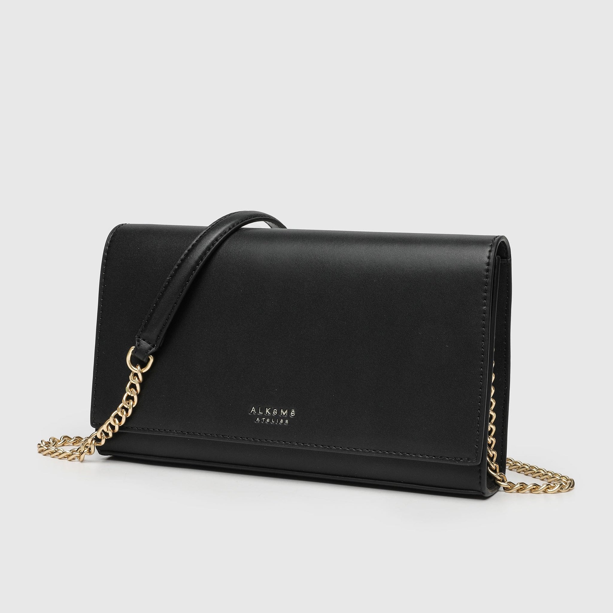 Earth Bag with front flap and magnetic snap closure, decorated with "Alkeme Atelier "logo, featuring a shoulder chain strap that can be worn as crossbody or kept inside the bag to carry the bag as a clutch.