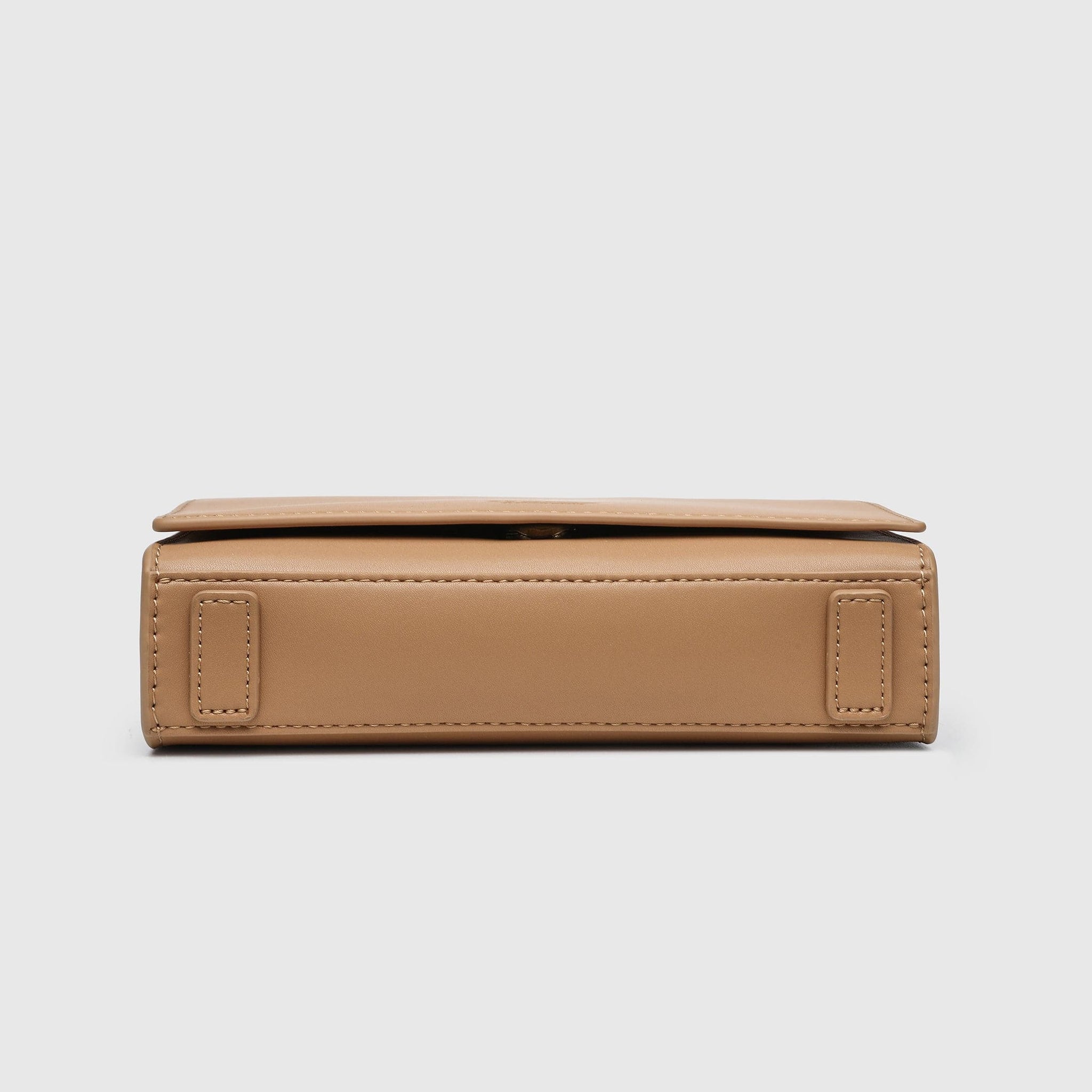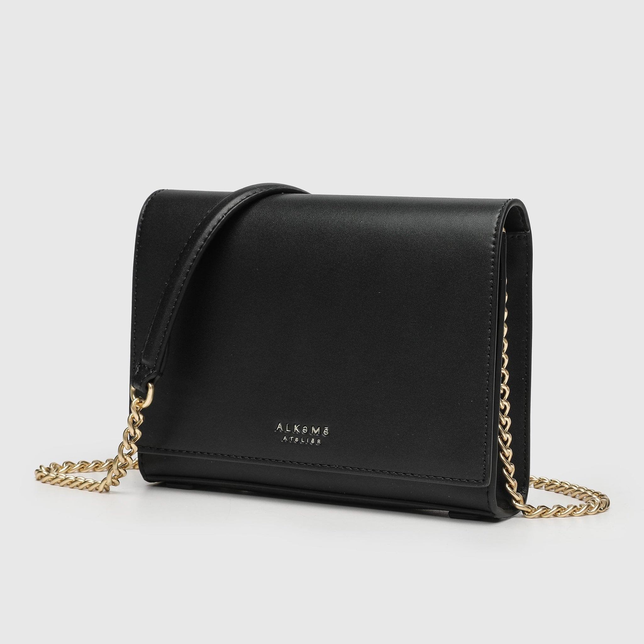 Earth Bag with front flap and magnetic snap closure, decorated with "Alkeme Atelier "logo, featuring a shoulder chain strap that can be worn as crossbody or kept inside the bag to carry the bag as a clutch.